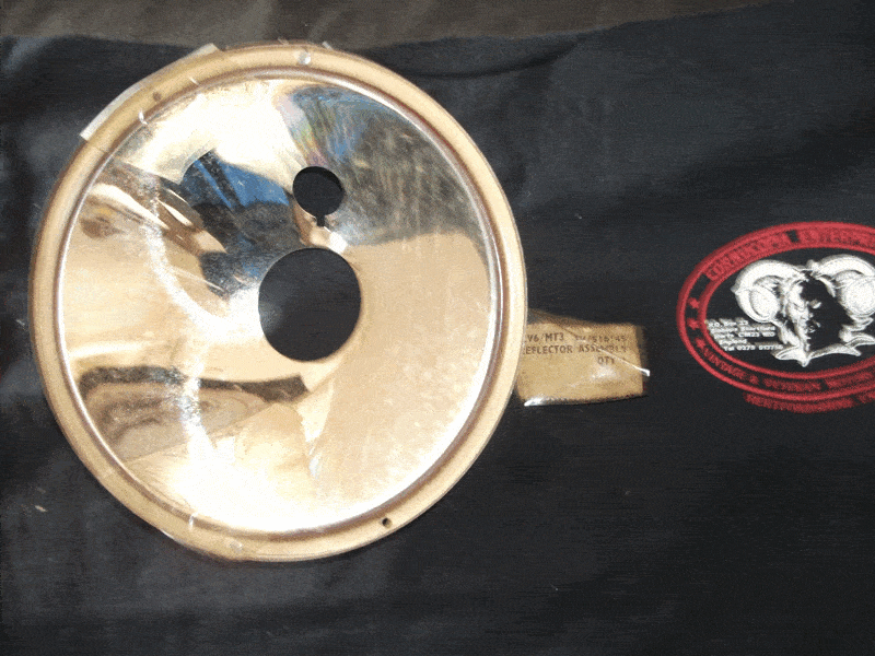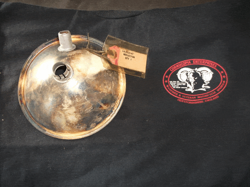 Lucas (genuine) flat glass type NOS 6 inch reflector. (Could be some storage marks on reflector) + used flat glass type 6 inch shell. Fits all War Dept machines M20 G3L W/NG etc. |