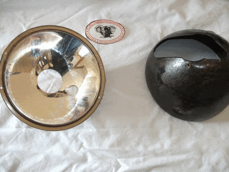 Lucas 6 inch head lamp shell. Genuine Lucas (used). No dents, for restoration. WAR DEPT TYPE. Fits BSA M20s; Matchless G3L, Ariel W/NG etc. |