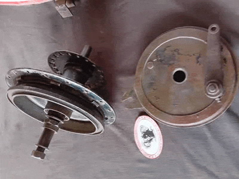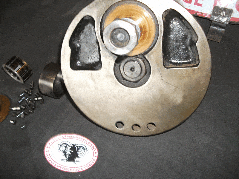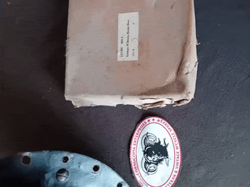 MATCHLESS G3L- G80 FRONT HUB 1941 - 46 (For Restoration) + Brake plate, Axel. (used) + set of four undrilled Genuine Linings NOS LVT/ MC 3836/3 Complete with Axel Bearings Nuts Etc (No Play in Bearings) Could Be a good Set of Bearings. Seems the Hub has had little Mileage. No Wear on Brake Drum Surface. (Two Spoke holes elongated). Original Army paint on Brake Plate. | MATCHLESS G3L - G80 1942 Front Brake Plate, Genuine AMC, For Restoration, Pt Nr 40-G12M-B60 (used) + Pair NOS Genuine Brake Shoes Pt Nr 41-12-B71A + Set 4 Genuine NOS Undrilled Brake Linings LU7/MC 3836/3. Including NOS Genuine Front Brake Arm Pt Nr 40-G12M-B65. Original army paint on B. Plate. | ||