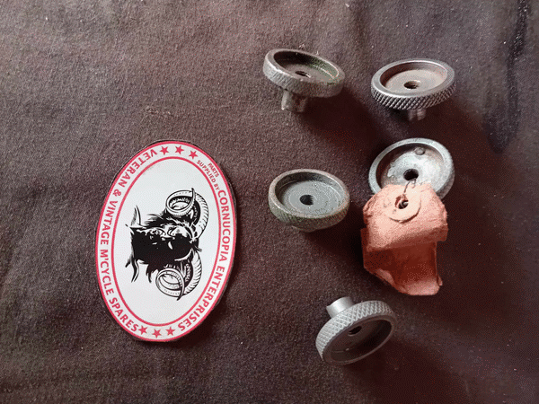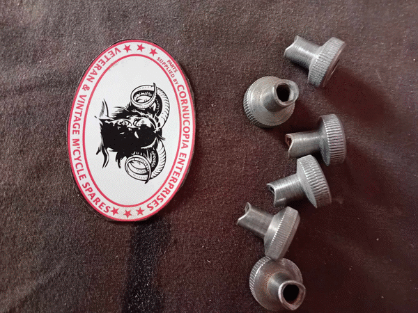 MATCHLESS - AJS SINGLES, TWINS 350cc-500cc REAR BRAKE ROD Adjusting Nut Pt Nr 022743 5/16 Cycle Thread Genuine AMC NOS Fits all models 1953 onwards | MATCHLESS - AJS SINGLES - TWINS 350cc 500cc REAR BRAKE ROD Adjusting Nut Pt Nr 00-0615, STD 615 Genuine AMC NOS 1/4 Cycle Thread Fits all models 1940 G3 - G3L, Etc 1955 | AJS Pre War GIRDER FORK 250cc 350cc? STEERING DAMPER KNOB + Damper Rod + Discs DIA 51mm, 4.14 mm Thick, Bore 10mm D. Knob + Rod Genuine AJS NOS (sand down surface to initiate friction properties) | Photos 163357 + 163250 + 163241 + 163227 AJS HEAVYWEIGHT STEERING DAMPER ASSY, Year 1940s? (Used) | ||