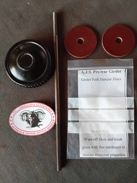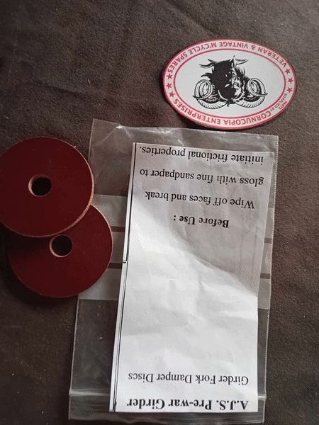 AJS PRE WAR GIRDER FORK DAMPER DISCS PAIR Replica DIA 51mm, Bore 10mm, 4.18mm Thick (Sand off gloss to obtain grip) | MATCHLESS AJS 350cc 500cc V. Lifter Arm Spring Pt Nr 013949 Fits Singles 1949-51 Genuine Matchless NOS |