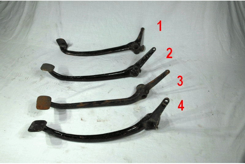 Matchless / AJS Foot Brake Pedals Genuine AMC ( used ) Pedal No ( 1 ) fits 1949-55 Models G3L. LS G80; Part No. 015090 Pedal No ( 2 ) Year; Model unknown; Part No. 022294 ( Type with Pin Spring, at Rear ) Pedal No ( 3 ) Year; Model unknown; Part No. 022200 ( Type with Pin Spring, at Rear ) Pedal No ( 4 ) fits 1959-60 250cc G2; Part No. 042448 ( Type with Pin Spring, at Rear ) also in Stock ( 5 ) not on Photo fits 1950-54 G9 , Mod 20, 500cc Twins; Part No. 014791 Many in Stock, just give us the Part Number |