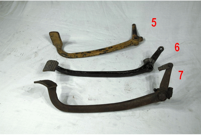 Matchless / AJS Foot Brake Pedals Genuine AMC ( used ) Pedal No. ( 5 & 7 ) fits all 1940-49 Rigid Models; Part No. 37-G3-B1 Pedal No. ( 6 ) Year; Model unknown; Part No. 19904 ( Type with Pin Spring, at Rear ) |