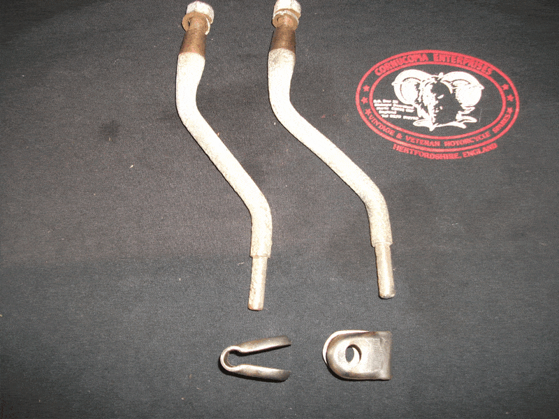 Ariel Head Lamp Brackets 1930s (For Girder Forks) Some rust pitting Bead Blasted. 18cm Long. Genuine Ariel, (used) For Restoration, + Pair Replica (New) End Clips. |