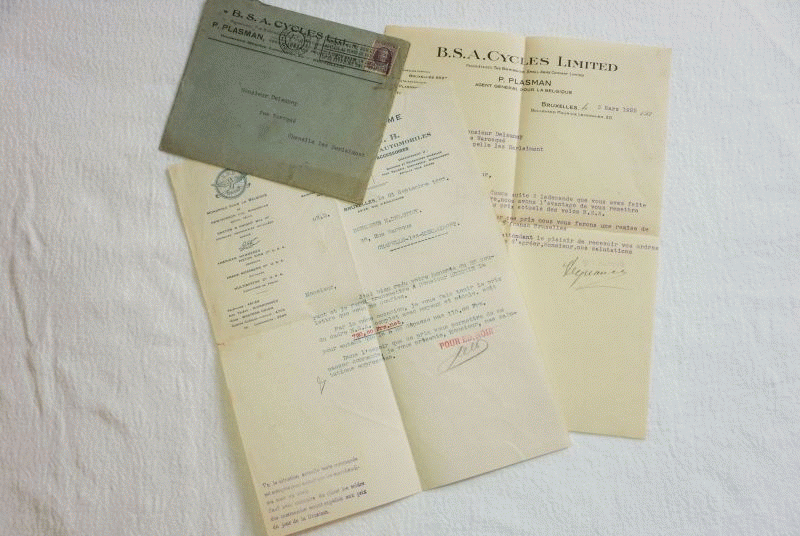 | BSA Genuine Letters sent to Customers - from BSA Dealers in Belgium, ED. Noirhomme Bruxelles Dated 1925 ( French Text ) - P. Plasman Bruxelles, Dated 1925 ( French Text ) includes Envelope both in Mint Condition |