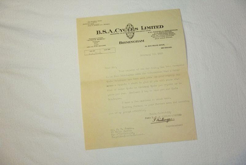 BSA Genuine Letter from BSA Works Birmingham to Customer In Belgium Dated 1926 ( English Text ) Mint Condition |
