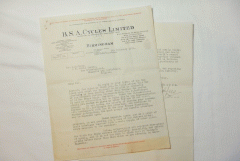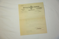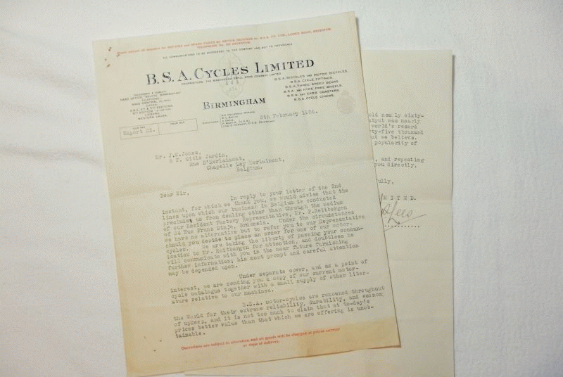 BSA Genuine Letters from BSA Works Birmingham to Customer in Belgium (Dated 1926,) English Text, Mint Condition. Letter Heading Printed in Die Stamped, Raised Type Face.. Giving Information to Customer, I. E. in 1924 and 1925 BSA sold Over 63,000 Motorcyles ( A World Record? ) also a few examples of letters from ( The Australian Motor Cycle and Bicycle, News Paper ) Letters are from Abercrave, Wales, and Townsville Queensland Australia ( A Mr Westwood in 1925, at that time 64 years of age, took a 2/1/4 HP BSA Across Australia, Townsville to Melbourne ) it Averaged 100 miles to the Gallon BSA agent at the time 1926 The Premier Cycle Company of Flinders Street, NSW Australia |