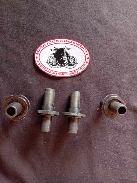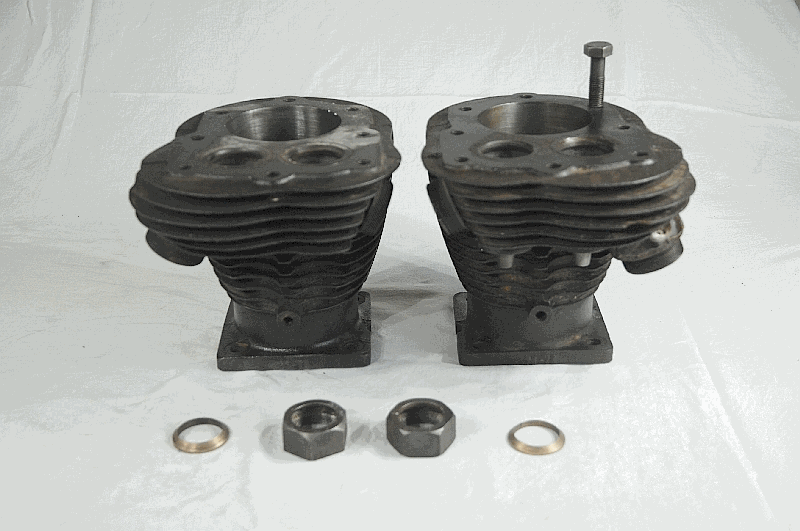 BSA Cylinders ( Pair ) Genuine ( used ) for Restoration Standard Bore Size is 80mm, both are bored to 82.5mm Condition of Bore good. Front Cylinder, all Fins OK, but has hairline crack near Bolt Thread, Exhaust Stub has also been welded, ( had been running in this Condition ! ) Rear Cylinder, perfect Fins, both have been fitted with none Standard, Replacment Valve seats, ( smaller in Dia ) Includes Set of Four Valves, ( Condition not good), also Replica Intake Manifold Nuts and Collars fits G14 V-Twins BSA Part No. 26-72 & 26-75 |
