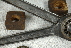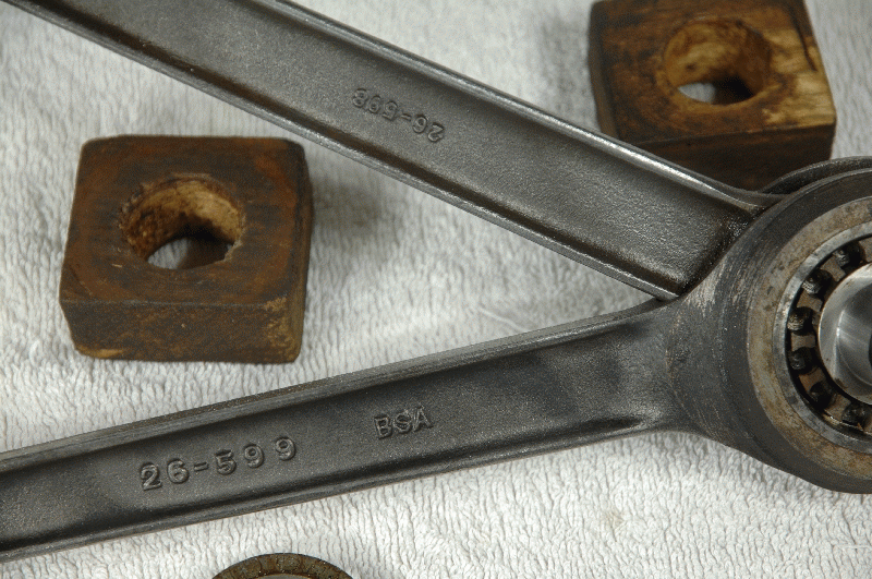 BSA Pair Con Rods Genuine ( used ) rebushed new Big End Shaft Fitted + Centre Rollers BSA NOS ( This Repair completed at the BSA Works ~1947 ) ( 28 Rollers missing from the outside bearing Cage ) fits G14 1000 V-Twins Part No. on Rods 26-599 and 26-598 Correct No 26-600 and 26-601 |