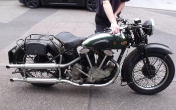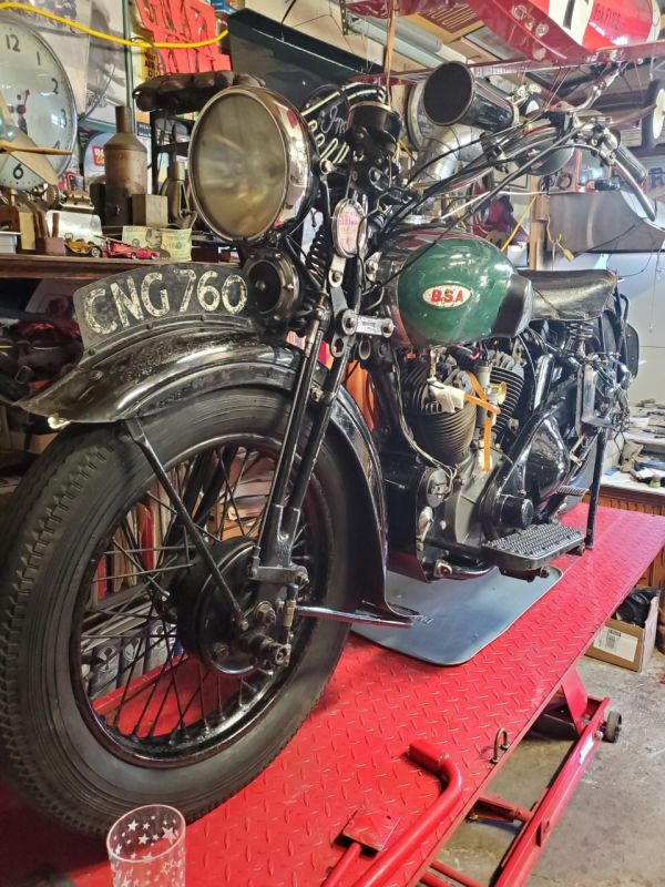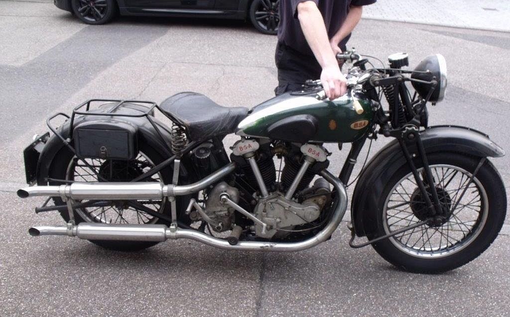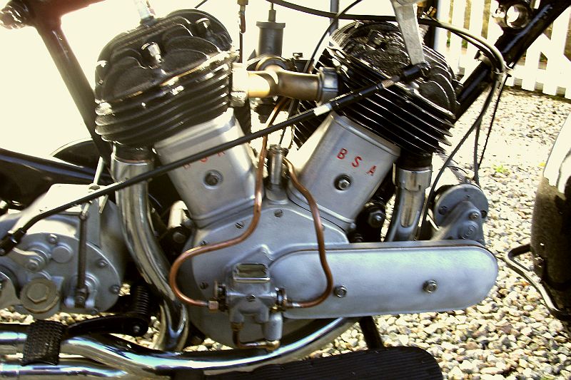 | BSA 1933-13 World Tour 986cc SV Owner retired Chief Engineer Ben Lang, Cornwall England. Bought for Pounds 25 in 1966 St Agnes Cornwall. Fitted with a 1932 Engine, registered in 1946. One could say the Restoration has taken 50 Years. Taken off the road in 1972, Restoration completed by Dels Motorcycles Cirencester. At present Ben is restoring a genuine BSA Chassie & Sidecar. |