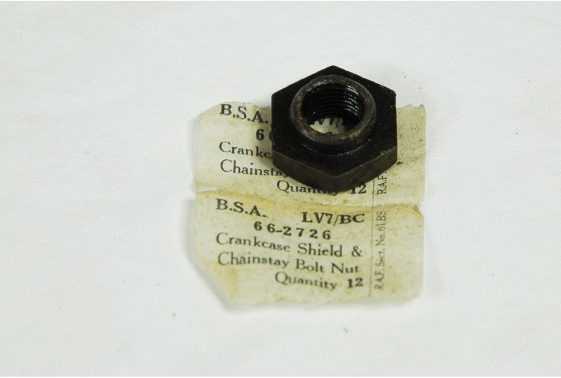 BSA Crankcase Shield and Chainstay Bolt Nut ( Sump Guard ) Genuine NOS fits M20 War Dept Models, when Sump guard is fitted Two needed fits M20 BSA Part No. 66-2726 |