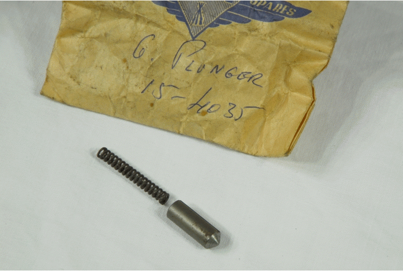 BSA ( 1 ) Gear Box,Gear Control Plunger ( 2 ) Gear Control Plunger Spring all Genuine NOS fits 1937-54 all Models incl. M20/21/33, B31/2/3/4, B21/2/24/25/26 ( 1 ) BSA Part No. 15-4035 ( 2 ) BSA Part No. 24-68 |