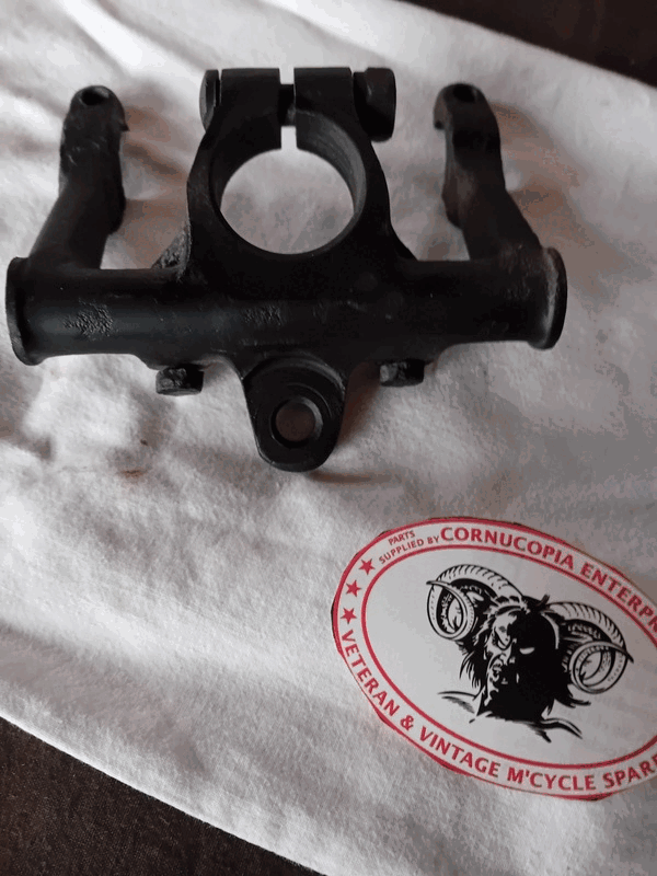 BSA GIRDER FORK TOP YOKE (used) Pt Nr 15-5139 4.11/16, Wide. Genuine BSA Bead Blasted, Fits 1932 Models 350cc L32-4 SV. Blue Star L32-5. 499cc S.V. W 32-6. + Blue Star W32-7. Also 1933 Models W33-5-6-7-8-9 INC SPECIAL. 7/8 = 22mm H.Bar Size. |