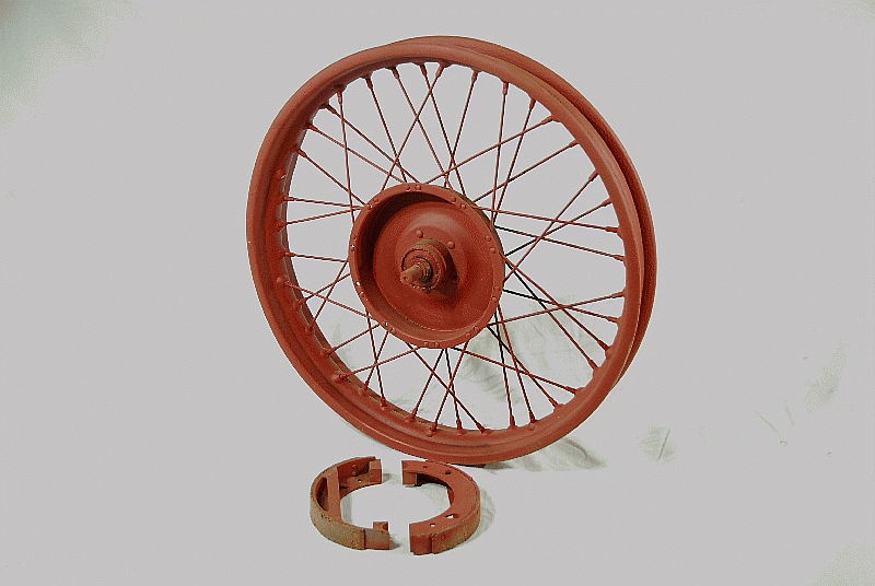 BSA Front Wheel and Brake Shoes Genuine BSA ( used ) less Brake Plate, Speedo Gear for Restoration see BSA Webb Page for Speedo Gears Bead Blasted, Primer Coat Hub surface not pitted Rim WM3, Spokes Bearings possibly need replacing includes Pair Steel Brake Shoes ( used ) ( need Relining ) fits 1932-35 all Models Blue Star, Empire Star etc. with 7inch Dia Hubs BSA Part No. 24-7981 & 24-7982 |