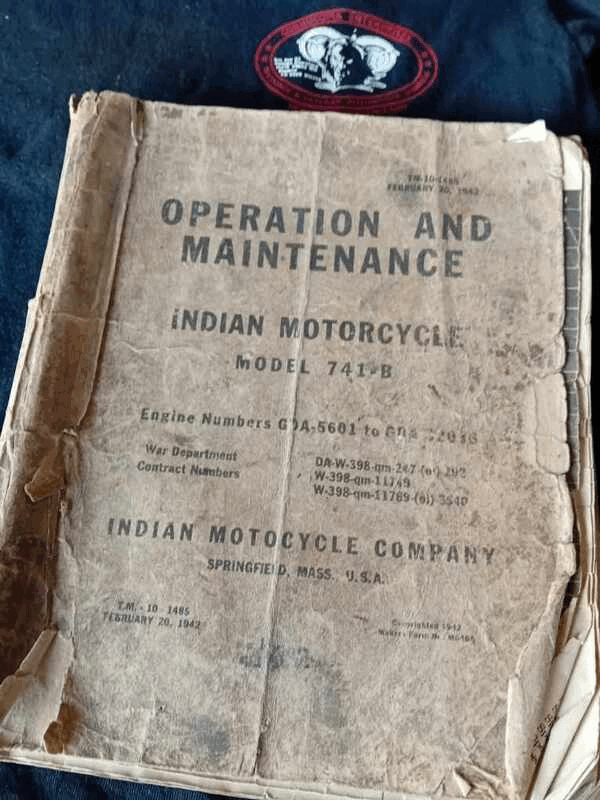 Genuine Indian 741B Factory Workshop Manual TM-10-1485 Feb 20 1942 For engines nos GDA-5601 to GDA-32036 Well used but complete original Indian 65 pages Operation and Maintenance Manual Covers bolts, nuts sizes, workshop tools – a mine of information |