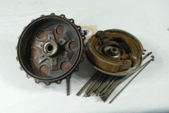 Norton Complete Front Hub & Brake Plate C/W Shoes, Bearings Etc Genuine Norton ( used ) ( Scalloped Type ) in good condition, Drum Surface, no scores ( Cooling, hole plugs in postion ) Please note, many Hubs fitted to 500T Models are a Standard 7 Inch Hub, with the scalloped Section filed out round the Drum, with Standard & Brake Plate fitted. ( includes a set of correct length used Spoke Set ) This Item has the original strengthened Brake Plate ( see Photos ) for Restoration fits 1949-50 Norton 500T Trial Model |
