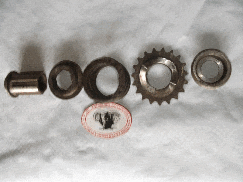 Triumph 3HW, 3SE. Crankshaft Shock Absorber Assy. Used Spring E.659. NOS 18T Sprocket. Sleeve (Used) in Perfect Condition E.511. + Used Coller E.396 + E. 1681 used Slider. Set of 5 Parts |