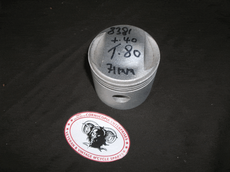 | Triumph Specialloid British Piston 8381 NOS; Bead Blaste, (Less Pin & Rings) 70mm STD SIZE. This Piston is oversize 0.40 THOU = 71mm. Fits 1939-40 COMPETITION T80 models. | |||||