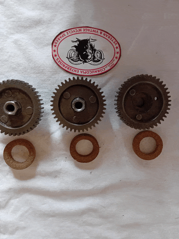 Triumph Front Hub Speedo Drive Gear + Speedo Gearbox Drive Gear fits Pre War Speed Twin, T100, 6S, T90 1937-42 2H, 3S, 3SE, 3H, T70, T80, T90, 5S, 5SE Triumph Hub Gear 58 Teeth Part No. W347 ( 1 ) / ( NX177B ) ( 1 ) Gearbox Pinion Gear 19 Teeth Part No. WX211 ( 2 ) - if possible give Internal and outer Dia of Gear in mm ( Two Types ) |