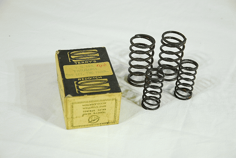 | Triumph Terrys Valve Spring Set Genuine Length ( Outer ) 54mm, Dia 40mm Length, ( Inner ) 47.5mm, Dia 26mm Two Pairs fits 1934-36 350cc OHV Models 3/2, 3/5, 500cc OHV 5/2, 5/4, 5/5, 5/10, Tiger 90 Terrys Part No. VS 258 |