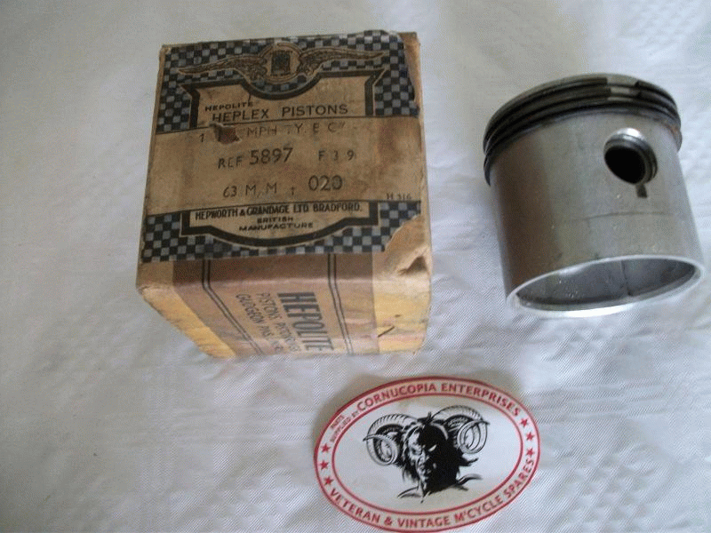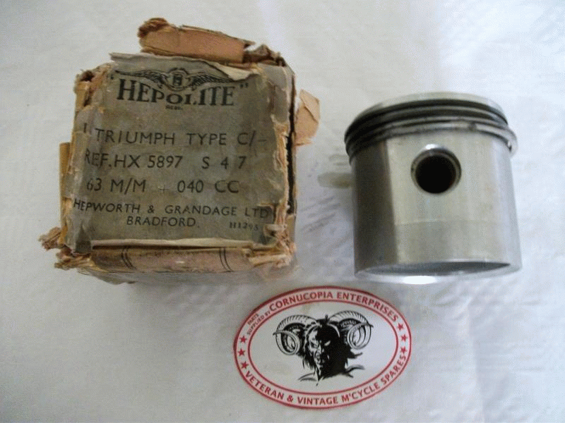 Triumph Piston Genuine Hepolite NOS complete + 0.20 Thou Oversize = 0,5 mm CR Ratio 6,92 to 1 Standard Bore Size 63mm fits 1934-40 250cc OHV 2 Port Mark 5, R5, 2/1, Tiger 70 HEP Part No. 5897 |