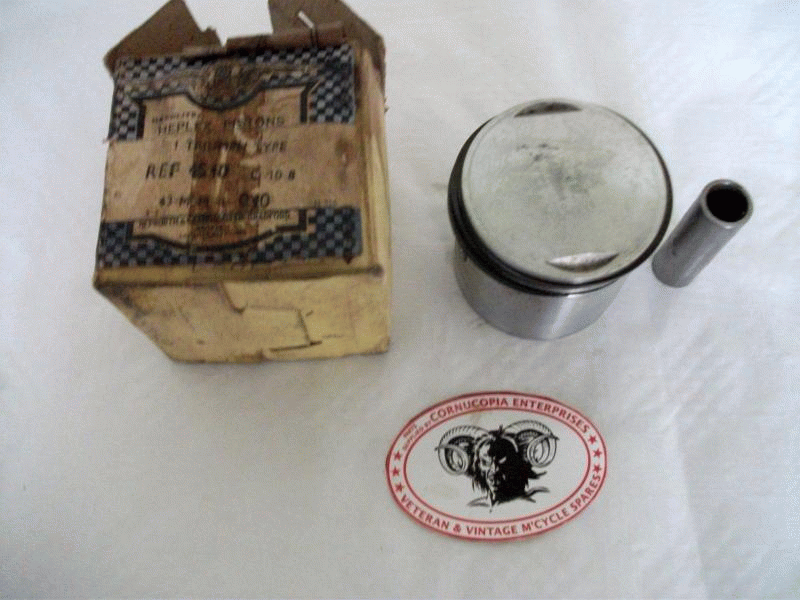 Triumph Piston Genuine NOS, Hepolite Part No. 7754 + 030 Oversize High Comp C. Rate 7 to 1 includes Pin, less Rings but some Pitting, Storage Marks Bead Blasted fits Triumph T80 350cc OHV Hepolite Part No. 7754 |