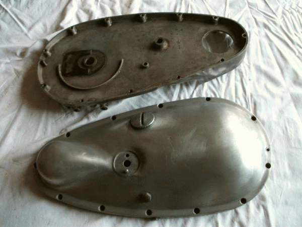 | Triumph Primary Chain Case Genuine Triumph for Restoration perfect matched Pair Type with Chain Oil Feed Adjuster Screw. Dia of Front Aperture 66,5mm, Width of Front Flange 44,6mm no Dents, Cracks, all Threads good includes Inspection Cap ( Genuine ) and used Fixing Screws fits Models 3H De Luxe, 3HW, 3SC, T80 1938-40 Triumph Part No. Outer Cover T/478 Triumph Part No. Inner Cover T/477 |