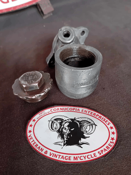 BSA S29 4.93 H.P. OHV 2 PORT LIGHT, REAR PRIMARY CHAINCASE. THIS VERY RARE CASE ONLY FITTED TO ONE MODEL! For 1929, Pt Nr 24-8758 Good CONDITION (used) Original Paint, For Restoration. | BSA Crank Case Oil Sump Filler; Complete with Bush / Cap, 24-1075 USED FOR RESTORATION To fit 1927/8/9 4.93 HP OHV + 1929 3.49 HP OHV 2 Port Super Sloper |